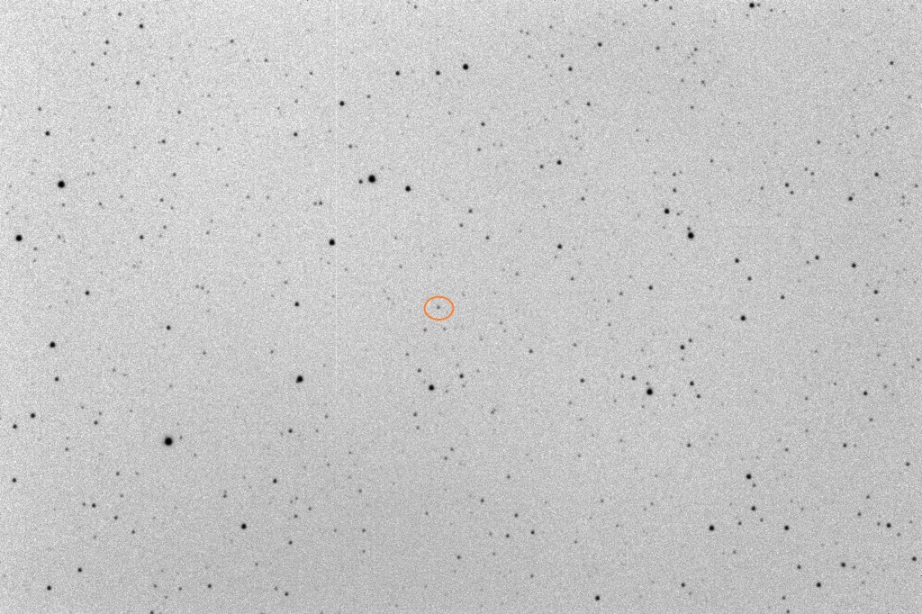 Two images taken at 2018-08-10T14:00:24 and the other at 2018-08-10T16:09:43 (so a bit more than two hours apart) from the Siding Springs Observatory in Australia. I used iTelescope.net, telescope T13. Each image is a 120 second exposure. Pluto is the faint object moving left/right just to the left of the center of the image.